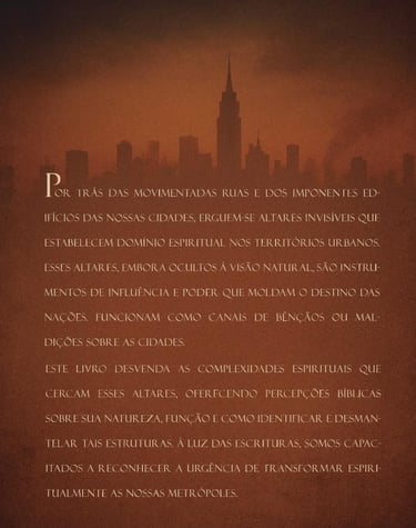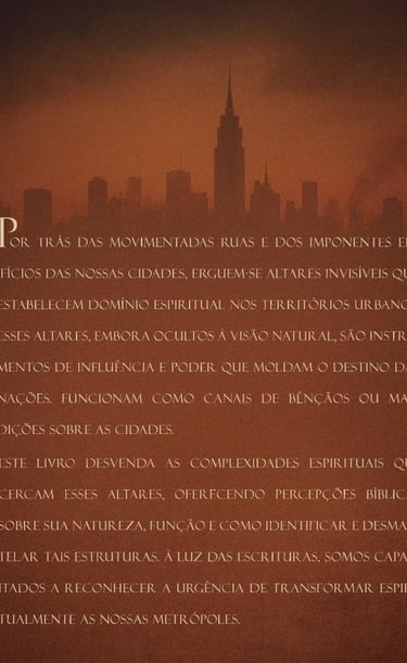 Antes das guerras e impérios, altares invisíveis já moldavam destinos. Eles não são apenas símbolos religiosos, mas portais espirituais que estabelecem jurisdição sobre territórios, famílias e nações. Este livro nasce da oração e da batalha, revelando que altares ainda existem, falam e influenciam realidades. Que ao ler estas páginas, você seja despertado para discernir os altares que cercam sua vida e chamado a restaurar os caminhos do Senhor, abrindo portais de glória entre céu e terra.